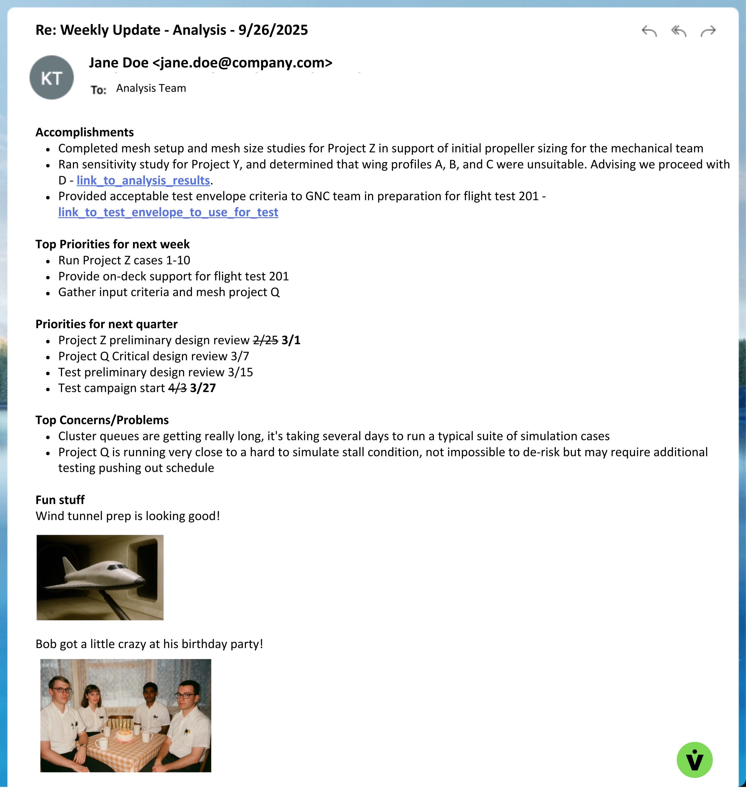 Pictures of team, tests, fun colorful CFD results, stuff you just want to show off about to the team, random fun stuff, etc.…